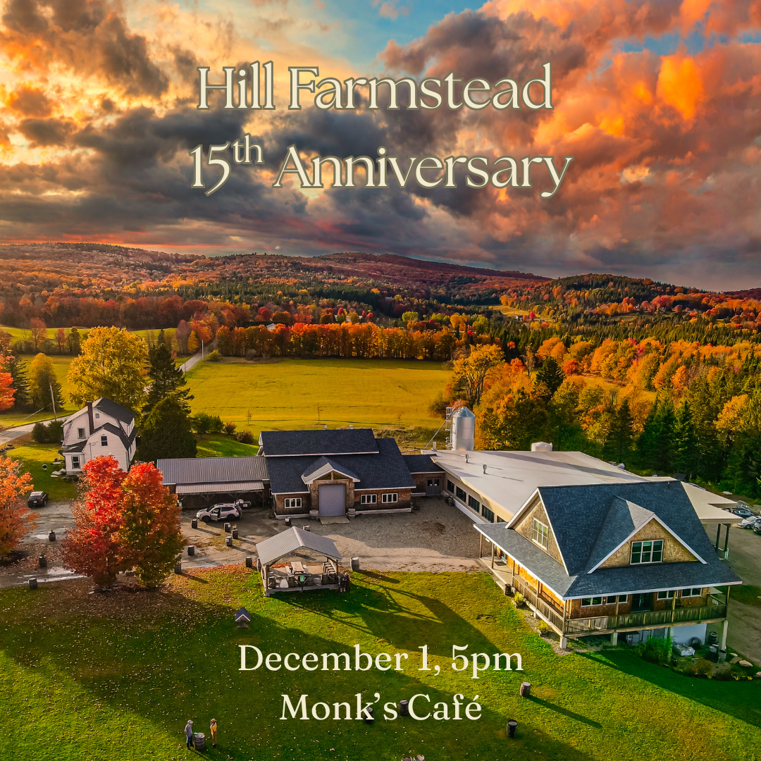 You are invited to a celebration of being and time on Monday, December 1, at 5 p.m., when Monk’s Café will pour an extraordinary selection of Hill Farmstead’s creations to commemorate the Vermont brewery’s 15th anniversary.